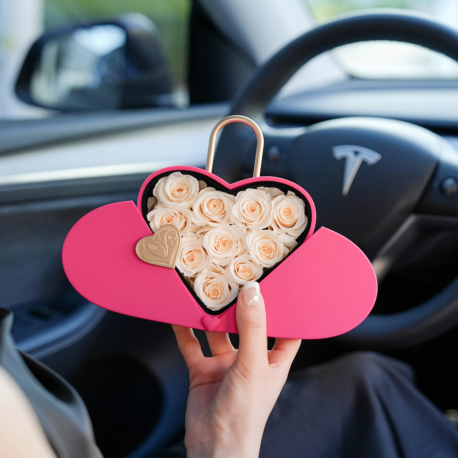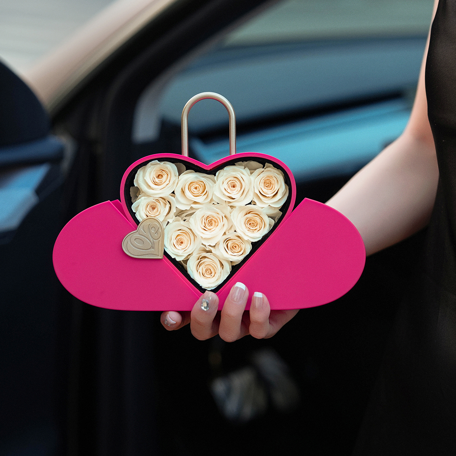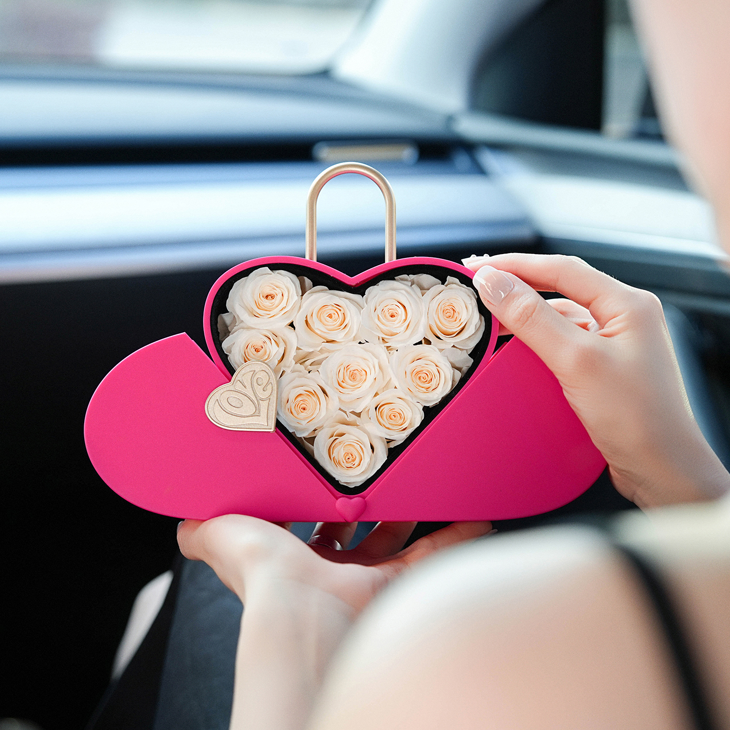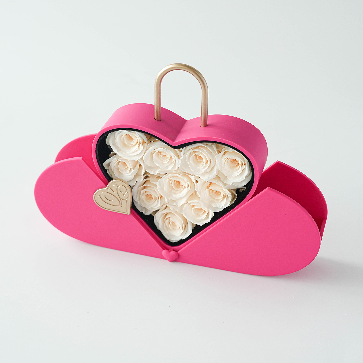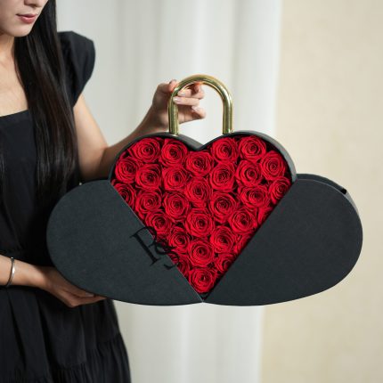Surprise gift box: Unveil the magic within as you open the box to reveal 10 eternal roses meticulously arranged to captivate the senses. Choose Box colors from delicate pink, vibrant fuchsia, and classic black. Crafted with sophistication in mind, Arrangement Details:Heart Lock Shaped Box Rose Lifespan: Approx. 2 Years+