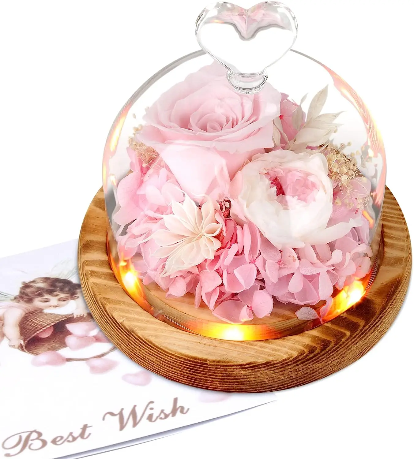??Light Up Preserved Rose Flower Gift??:The rose flower in glass dome surround a LED light. LED rose light can use in daytime and nighttime for home room decorations or create romantic atmosphere. The pink glass rose is not only beautiful valentines gift, birthday gift, wedding decorations, but also a warm night light.